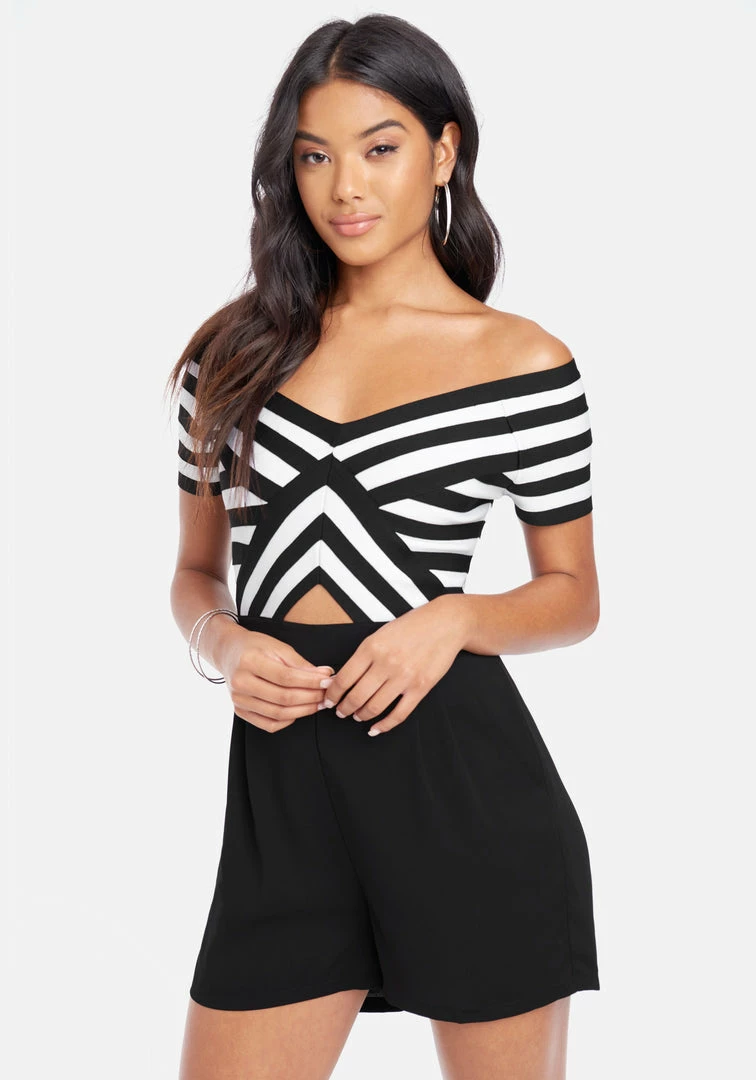 A fun and flirty style that can be dressed up or down. The Bebe Off Shoulder Stripe Romper adds some sizzle to your wardrobe.