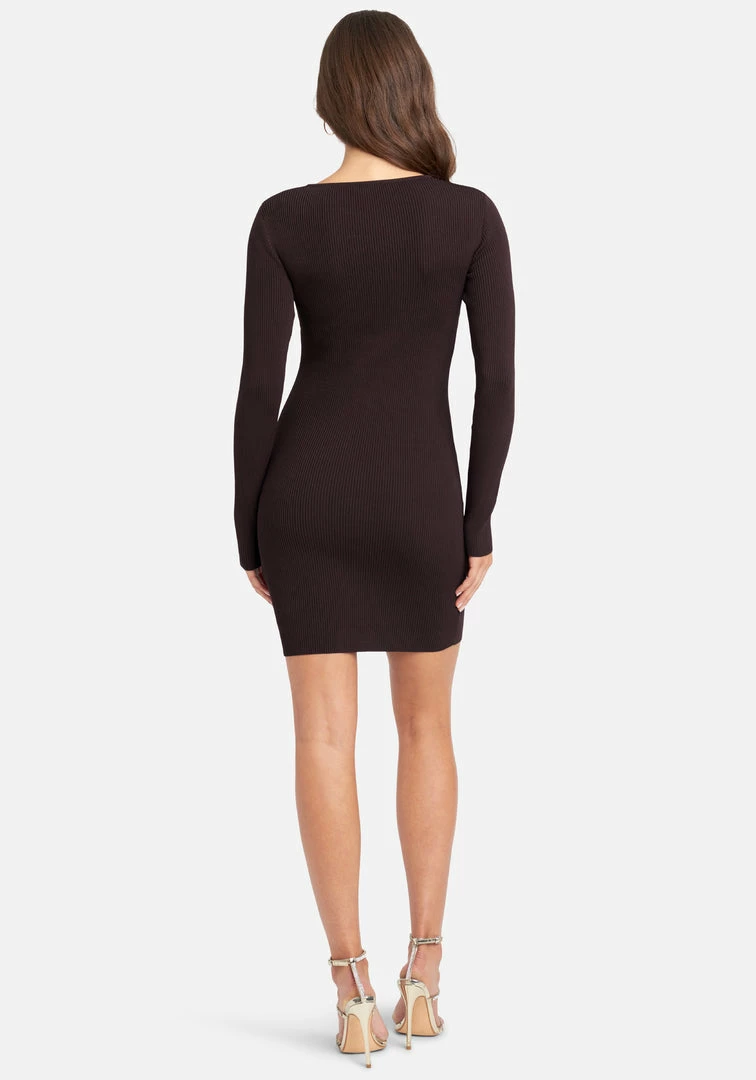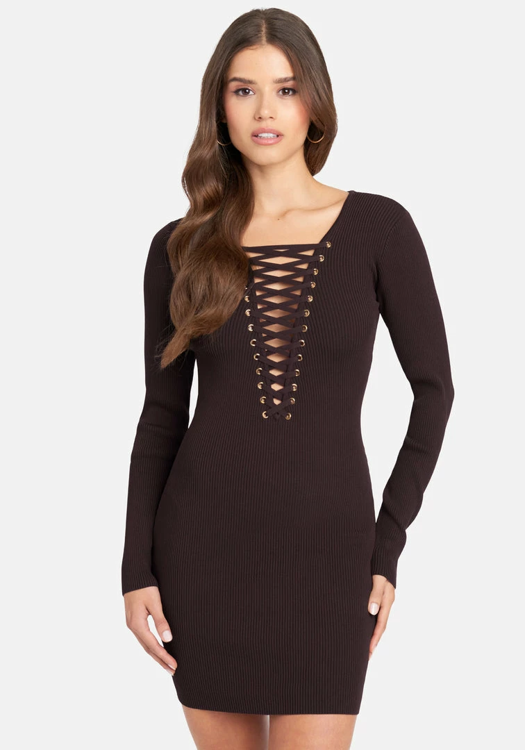 Take the plunge this season. This curve-enhancing ribbed Lace-Up Sweater Dress features a sexy deep V-neck and long sleeves.