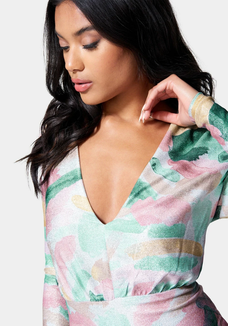 Bring the shine this season. This shimmering lurex knit dress features a tonal abstract print, blouson silhouette, plunging neckline, and long sleeves.
