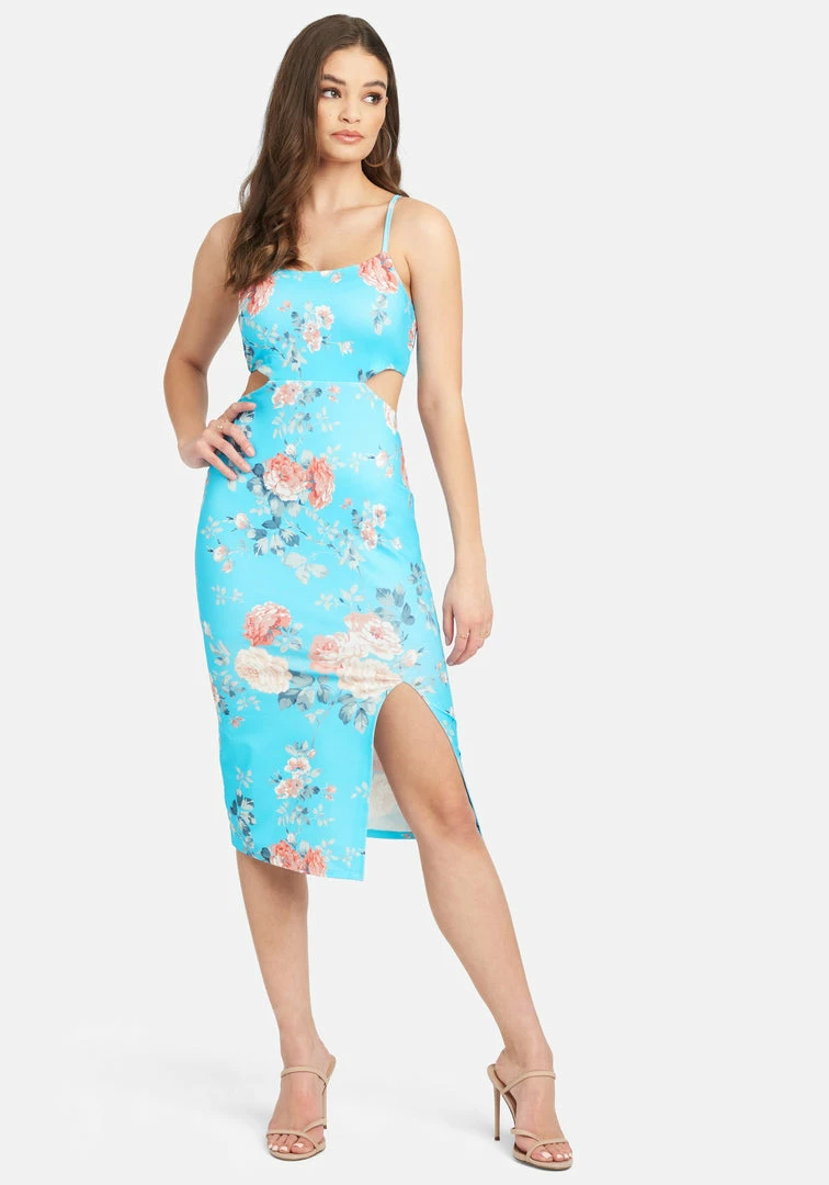 If florals and cutouts met… Our Printed Midi Dress features an allover floral print, edgy cutout sides, adjustable straps and a front side slit down the leg.