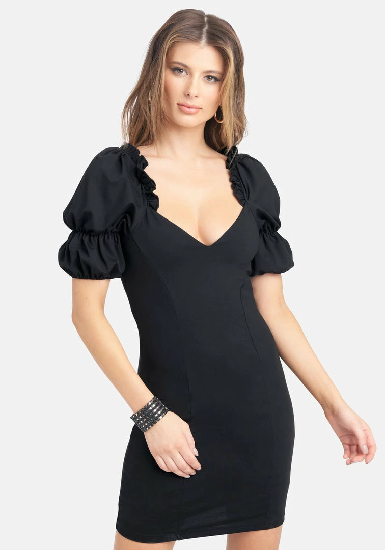 Sweet or sexy? You decide. The Puff Plunge Neck Mini dress features a plunging neckline, puffed sleeves, and a fitted silhouette. Perfect for a day out on the town or date night.