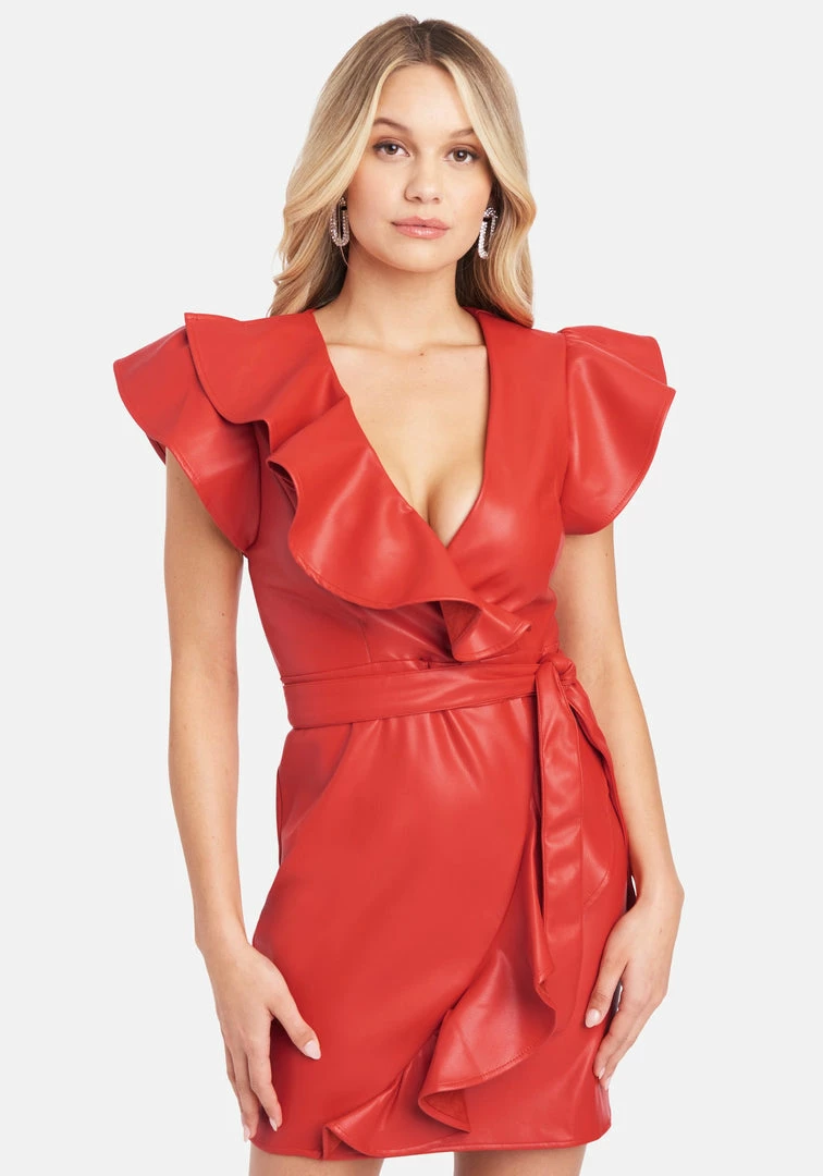 Show off your style in this Faux Leather Dress. Featuring a ruffle neckline, sleeve, and skirt. Adjust the waist tie for the perfect fit.