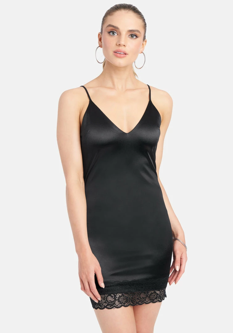 The Satin and Lace Slip mini Dress. Featuring a Stretch satin a figure-hugging silhouette. Features a scallop peekaboo trim at the hem. Center back invisible zipper with hook and eye closure.