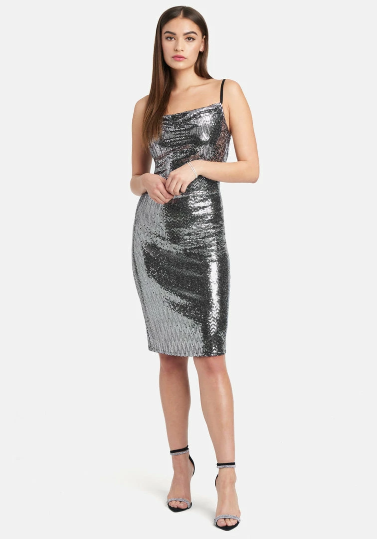 This A-list-approved midi dress has a shiny sequined silhouette with a classy cowl neckline. Clear tank straps help keep the dress in place without distracting from the shimmer. This dress is sparkling with perfection.