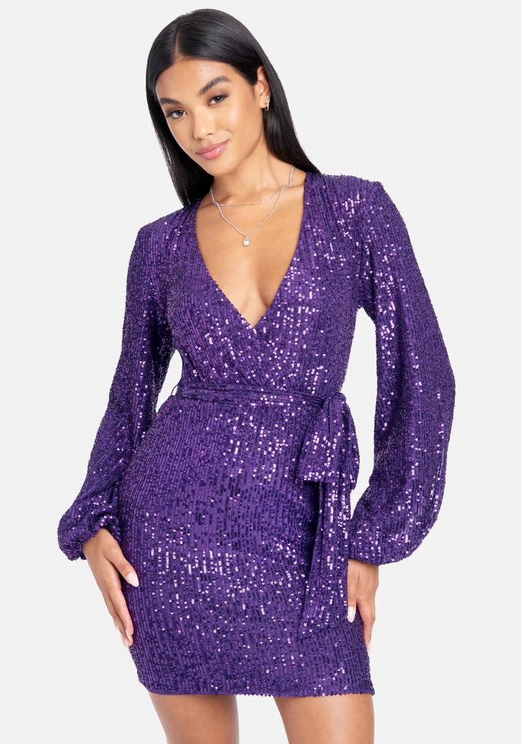 Wrap up your look in this sexy sequin mini dress. Stand out in this number with this dress featuring all over sequins, wrap design, and long sleeves.