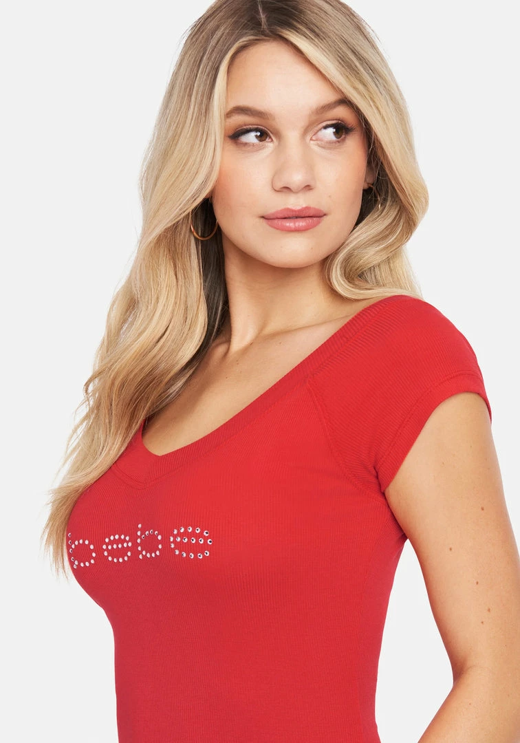 Opt for a versatile style you can easily throw on and always look great in. This Bebe Short Sleeve Double V Neck Logo Dress features a shapely fit and a crystal-embellished logo.