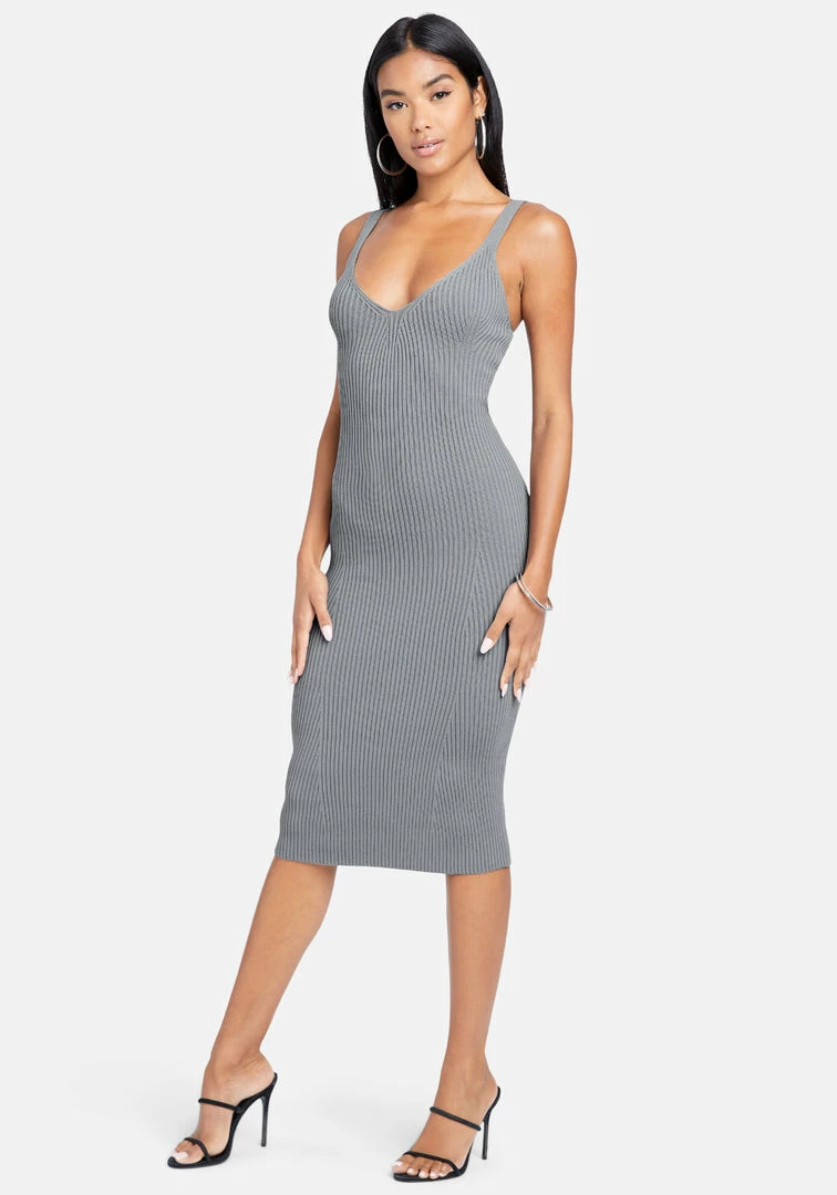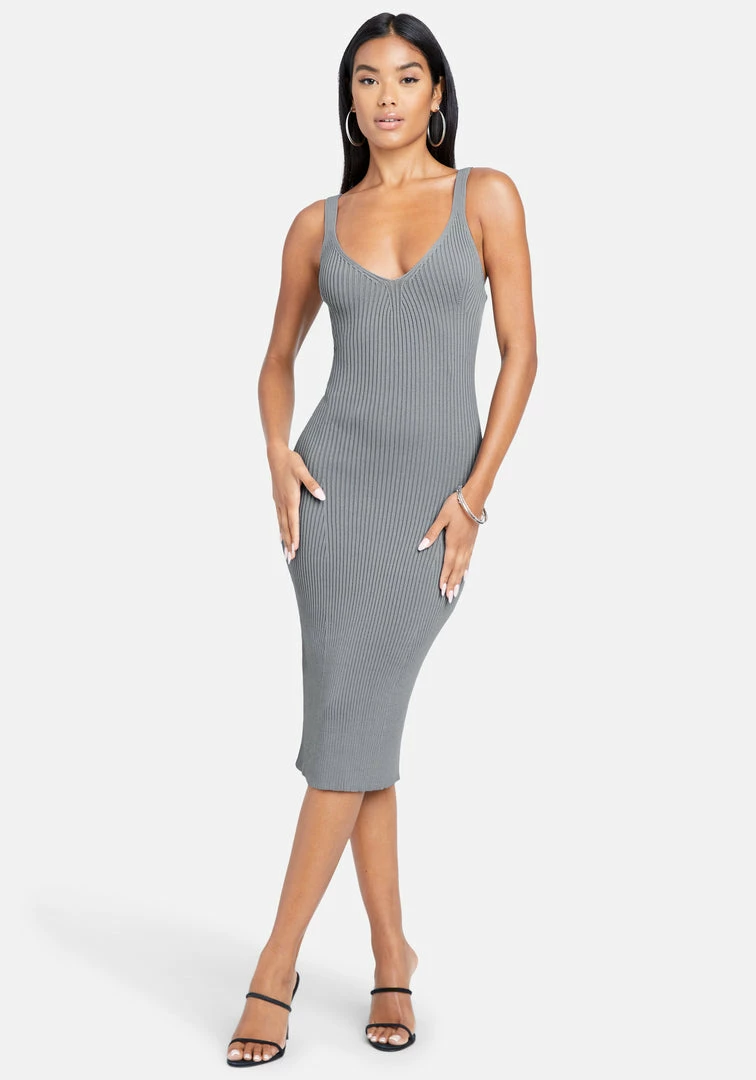 The Bebe Sleeveless Midi Sweater Dress keeps it simple and sexy for any day or night outing. It features a plunge v-neckline on a bodycon midi silhouette.