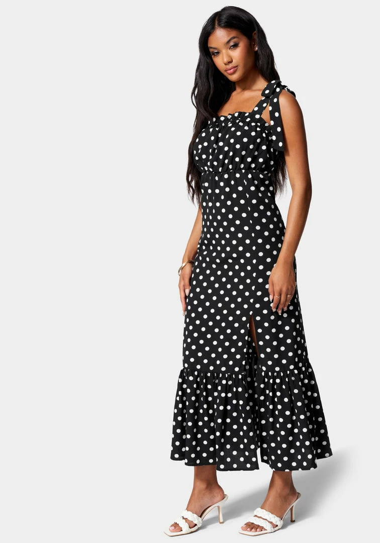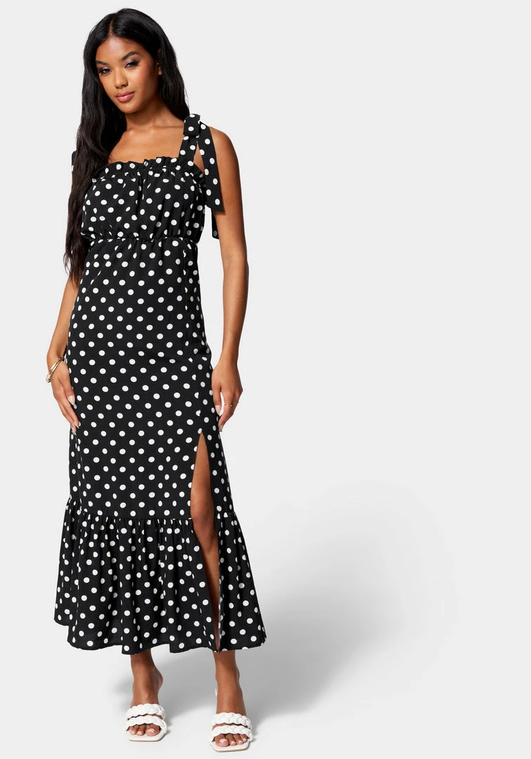 A wardrobe classic. This midi dress features an all-over polka dot print, tiered ruffle layers, self-tie shoulder straps, and a slit along with the skirt.