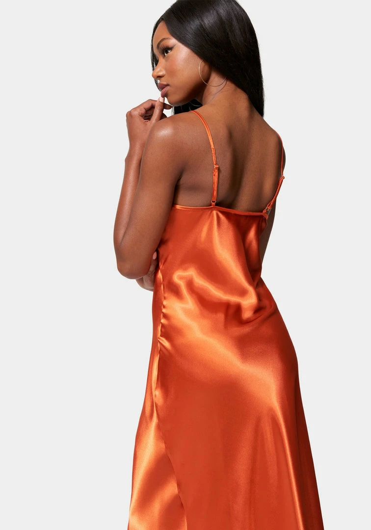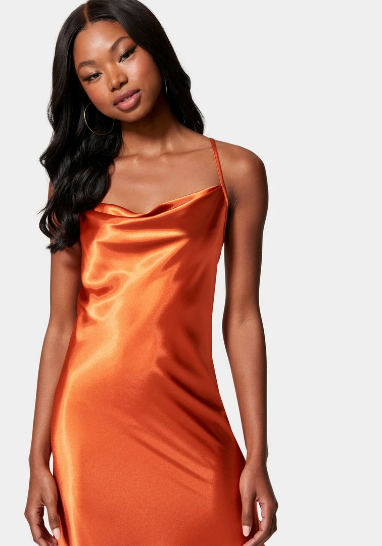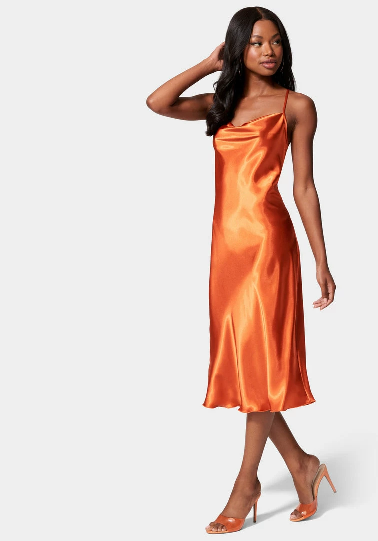 The iconic satin slip dress makes a comeback. This cowl-neck midi style is a wardrobe staple.