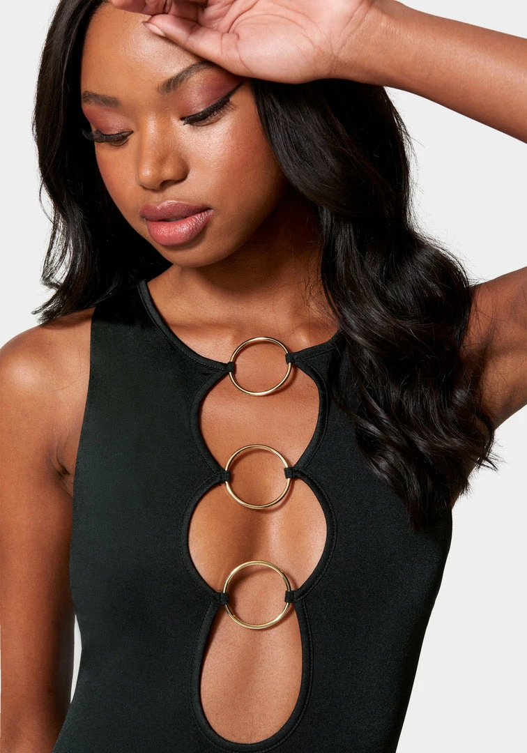 When in doubt, cut it out. This sleeveless midi dress features a sultry front cutout design with polished ring details, a bodycon silhouette and a concealed back zipper.