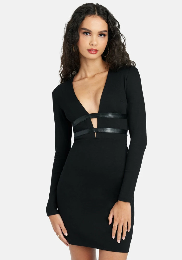 It’s all in the details. This chic mini dress features a vegan leather band and a form-fitting silhouette. Perfect for cocktail hour or a night out!