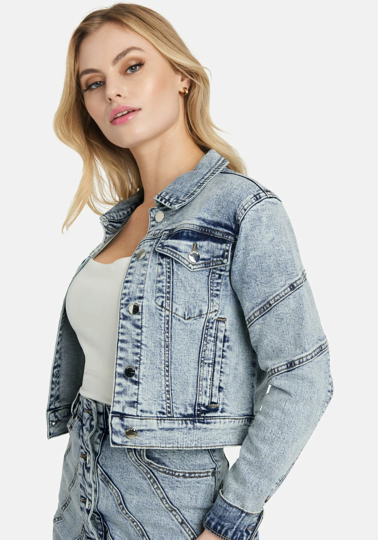 Rock and roll, baby. This cropped denim jacket features an all-over acid-wash, multi-stitch detailing, 2 button-flap chest pockets, and front slip pockets. Pairs perfectly with our Multi Stitch Button-Front Denim Skirt.