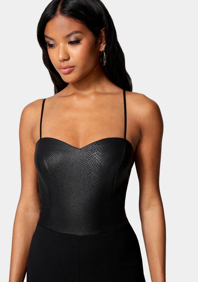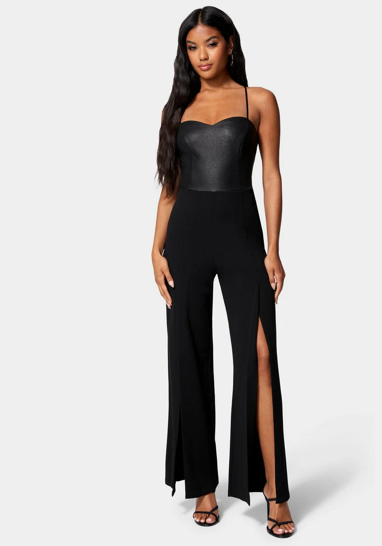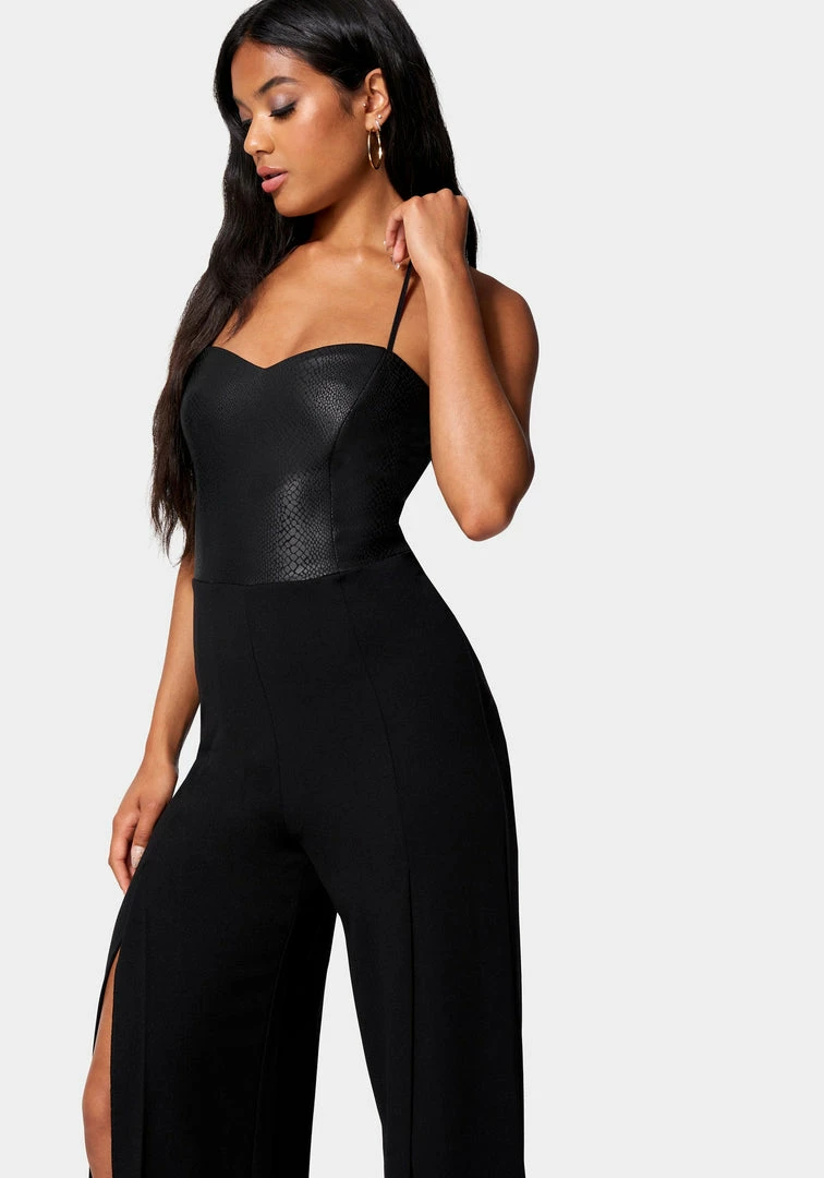 This chic Faux Leather Jumpsuit is the perfect all-in-one look. Featuring a sweetheart neckline, front leg slits, and a bodycon fit.