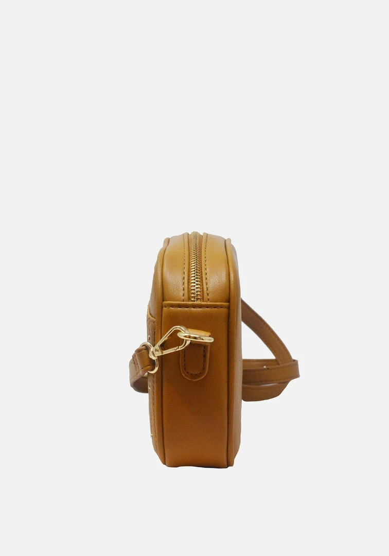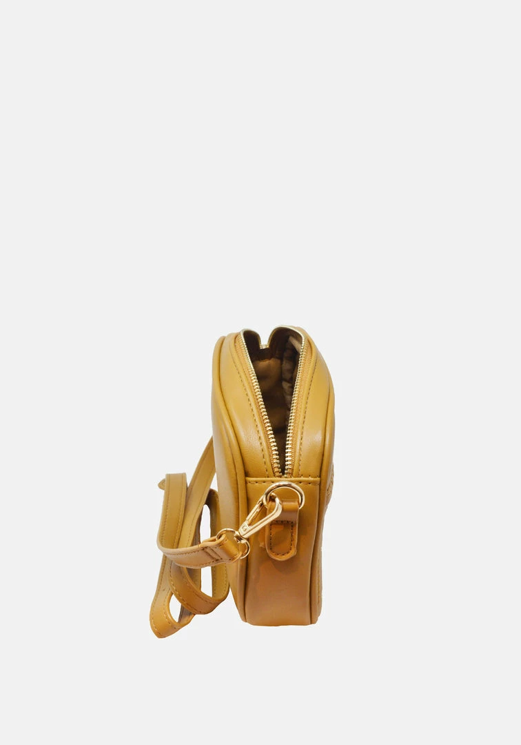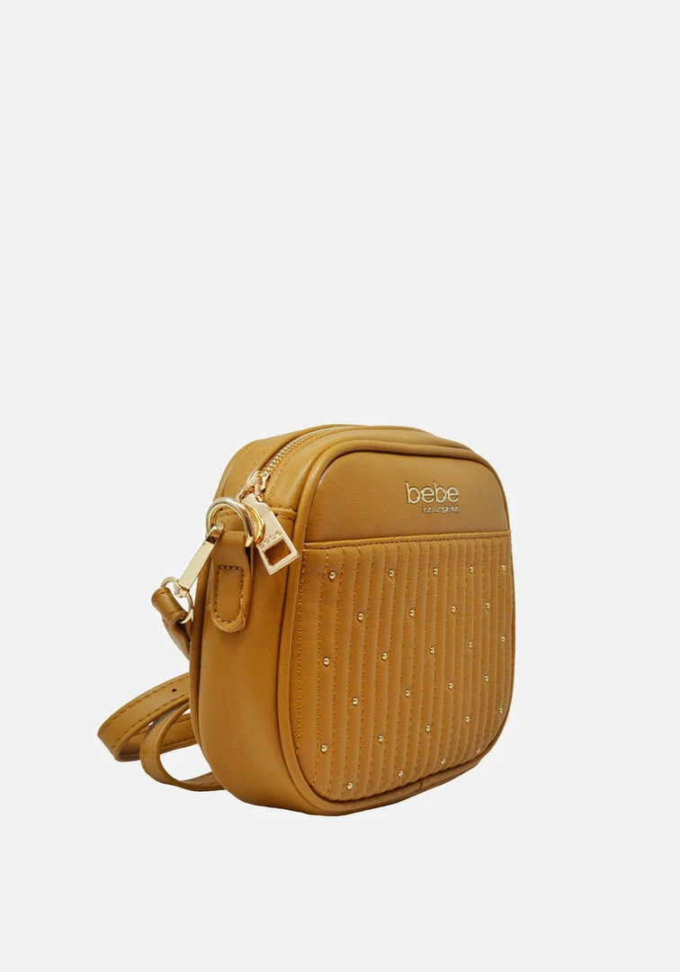 A signature Bebe logo is featured at the front of this compact camera crossbody bag with a top zipper, quilted design, and gold accent studs.