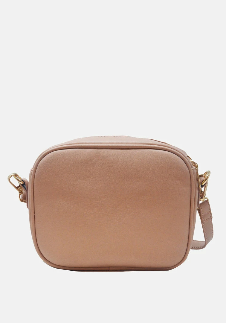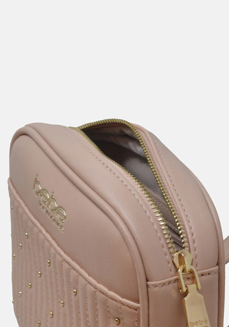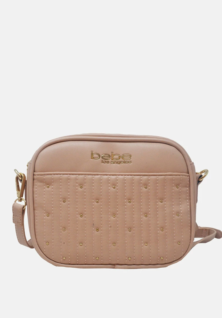A signature Bebe logo is featured at the front of this compact camera crossbody bag with a top zipper, quilted design, and gold accent studs.