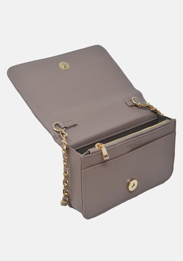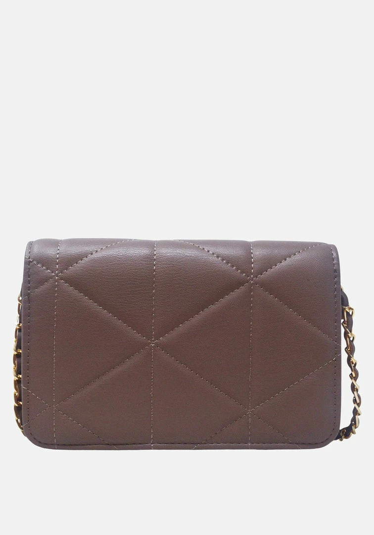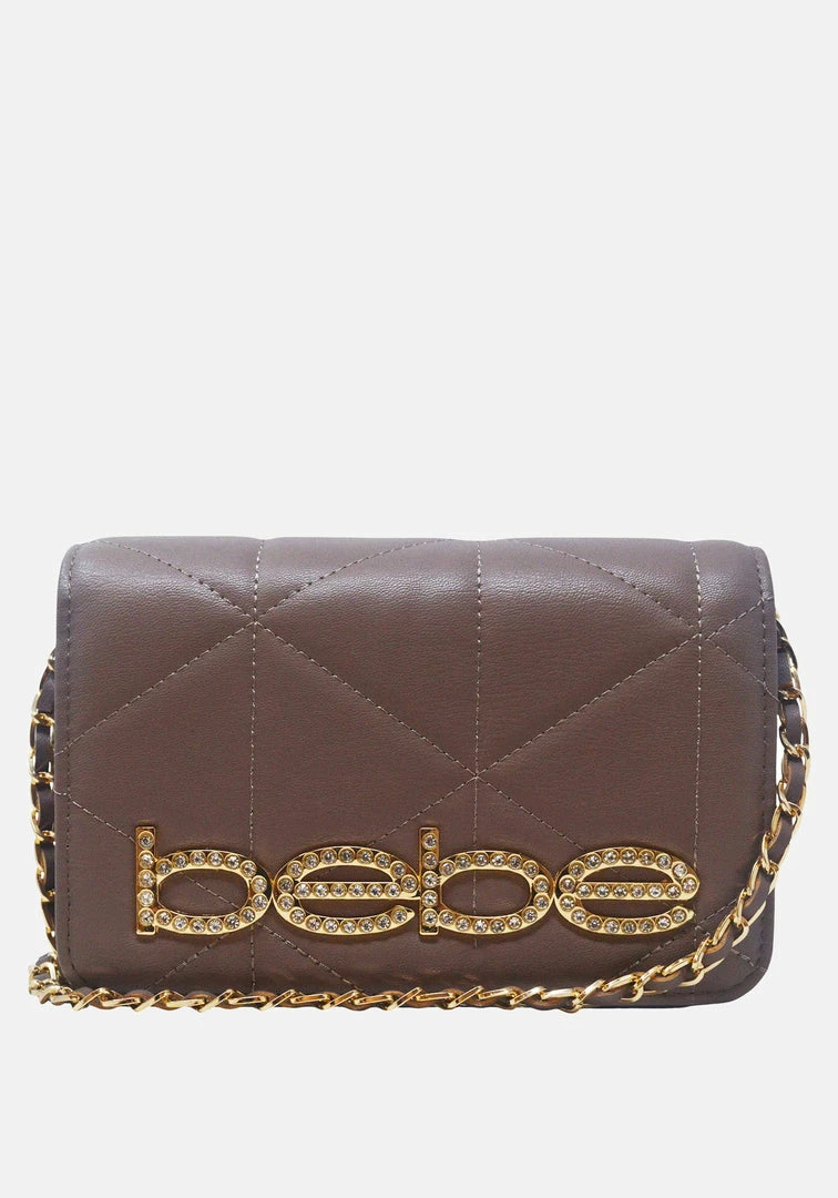 Simple yet show-stopping style. This flap closure crossbody features a diamond quilting design with a gold rhinestone logo and a detachable braided chain crossbody chain.