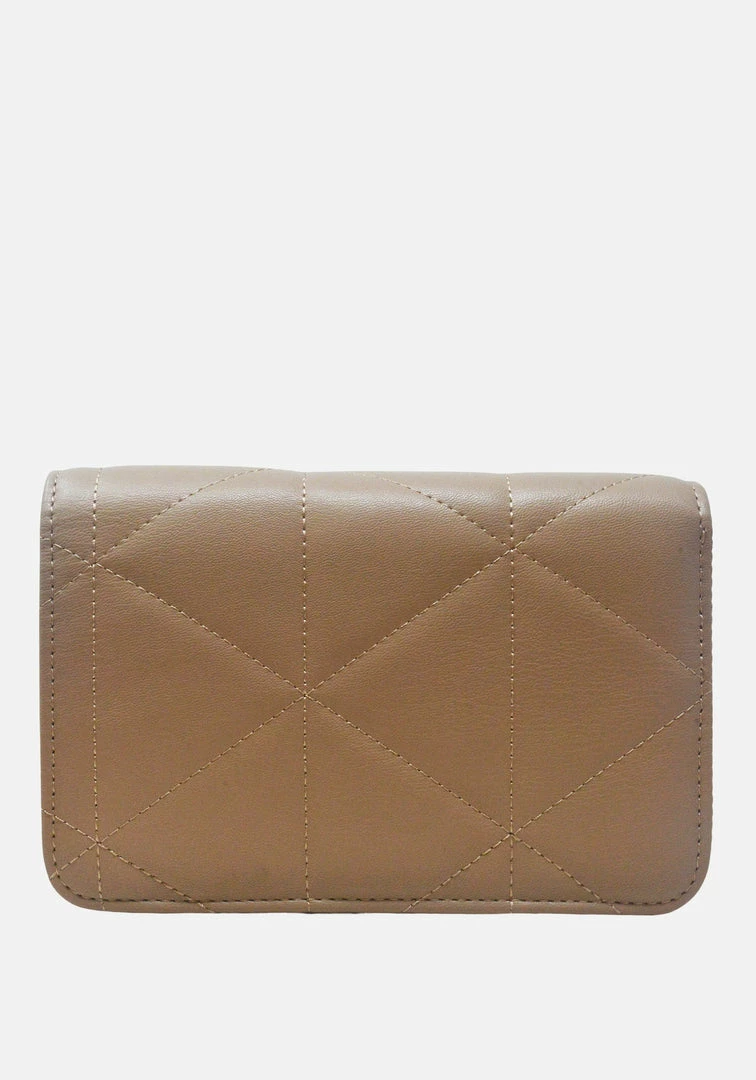 Simple yet show-stopping style. This flap closure crossbody features a diamond quilting design with a gold rhinestone logo and a detachable braided chain crossbody chain.