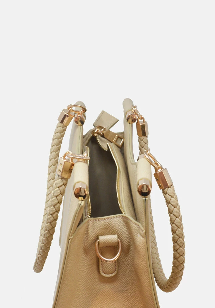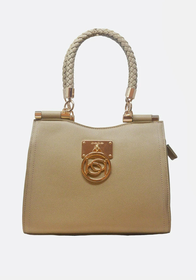 The perfect shopping companion is a stylish bag. This mini shopper bag features braided rope top handles, a detachable crossbody strap, and charm logo plate detail.