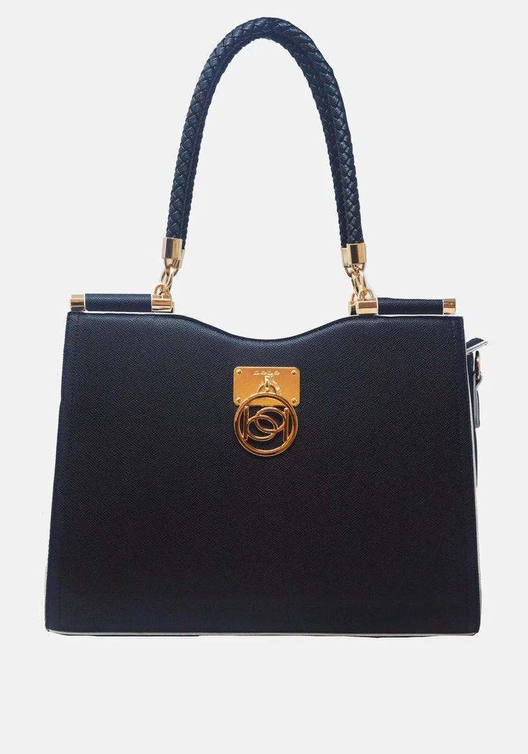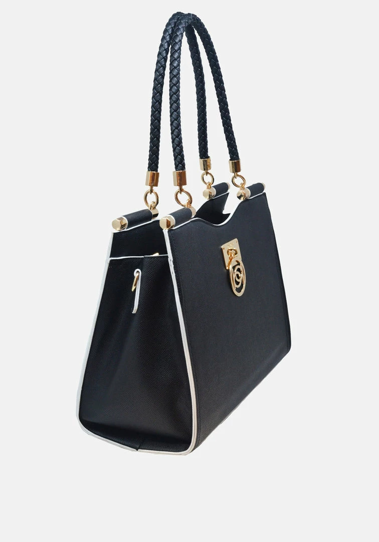 The perfect shopping companion is a stylish bag. This shopper bag features braided rope top handles, a detachable crossbody strap, and charm logo plate detail.