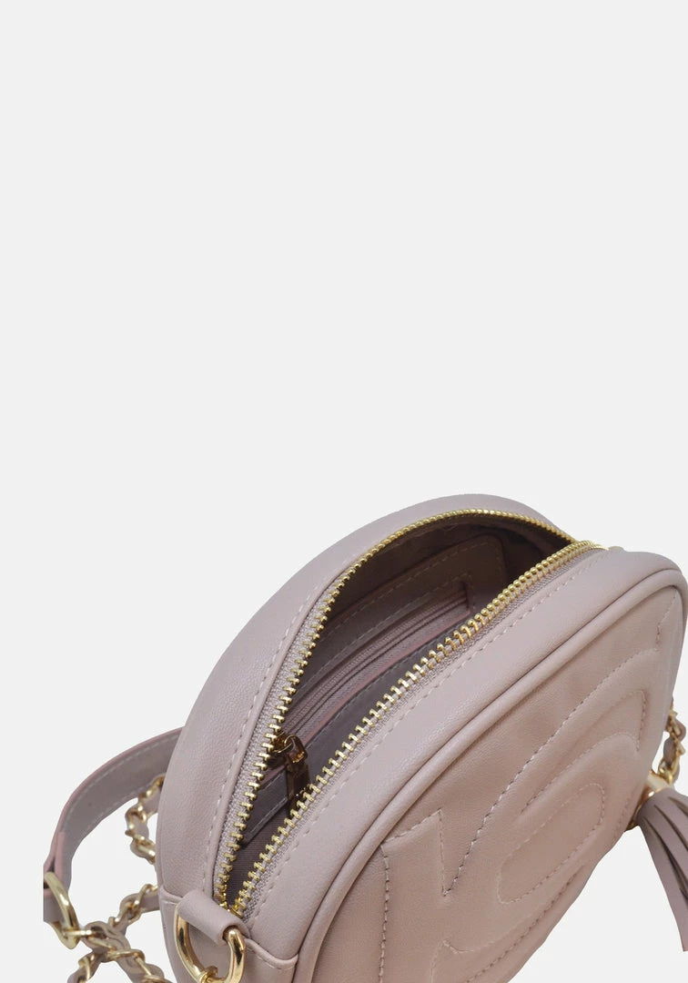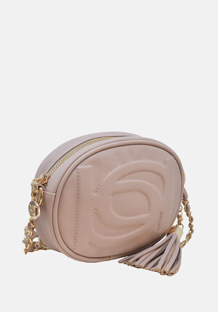 An instant icon. This cute round zip-top crossbody features an embossed front logo and hanging tassel to carry your essentials in style.