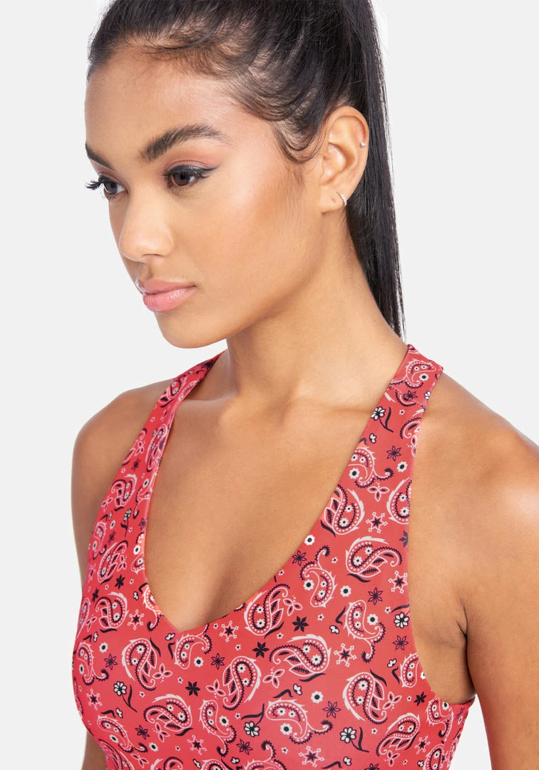 Break a sweat looking cute in the Bebe Bandana Print Sports Bra featuring a v-neckline, racerback design, and padded cups for support & shaping.