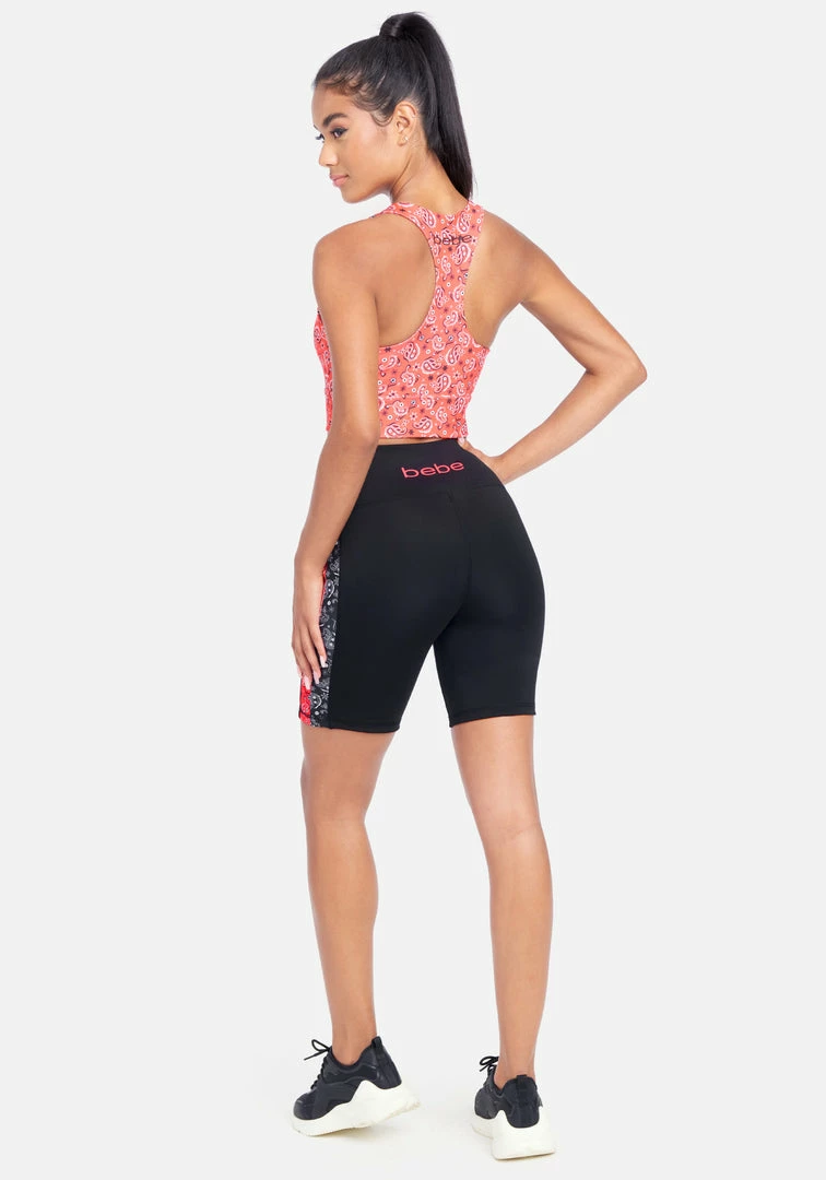 The gym is your fashion show in the Bebe Bandana Bike Short, featured in a high-rise fit, side pattern detailing, 4-way stretch fabric in a flattering silhouette.
