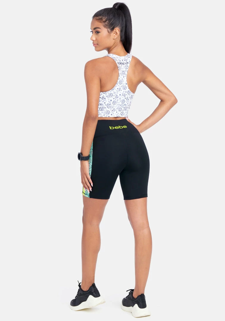 The gym is your fashion show in the Bebe Bandana Bike Short, featured in a high-rise fit, side pattern detailing, 4-way stretch fabric in a flattering silhouette.