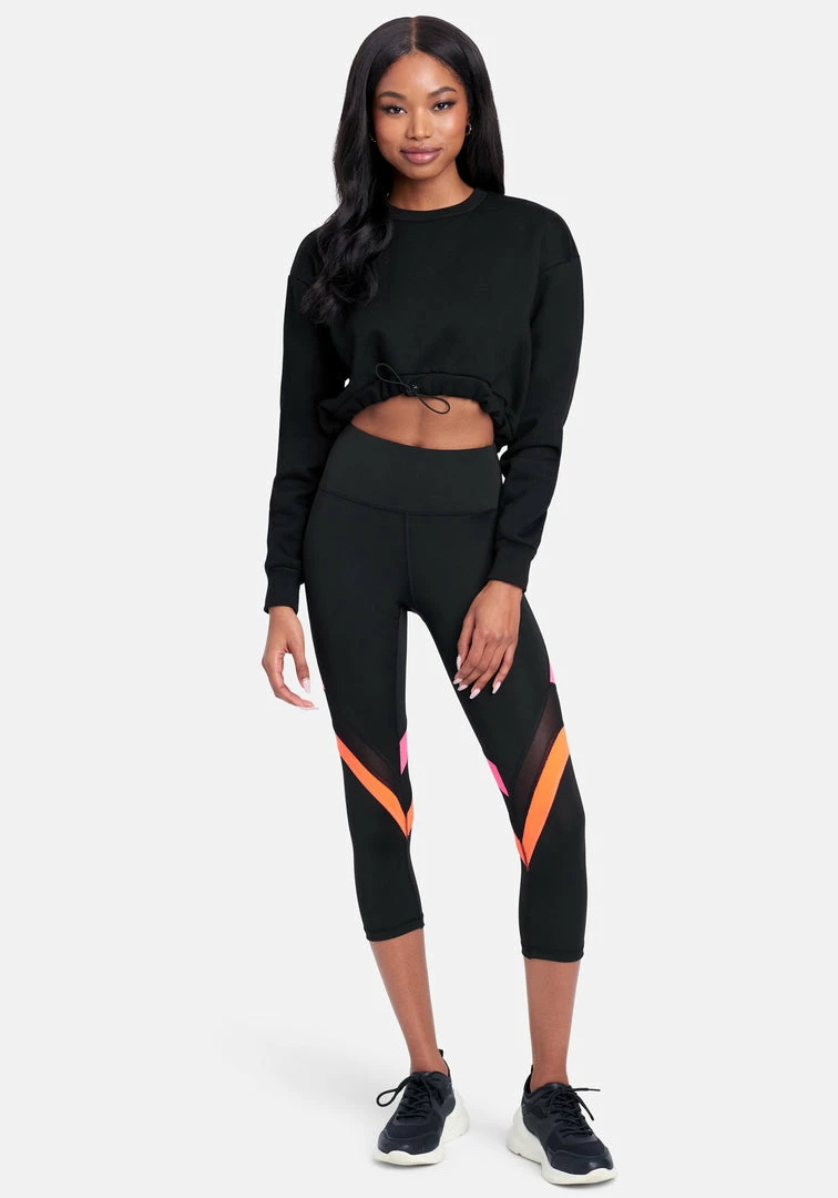 Add a sporty touch to your athleisure with our signature Colorblock Capri Leggings, featuring racing stripes down the sides.