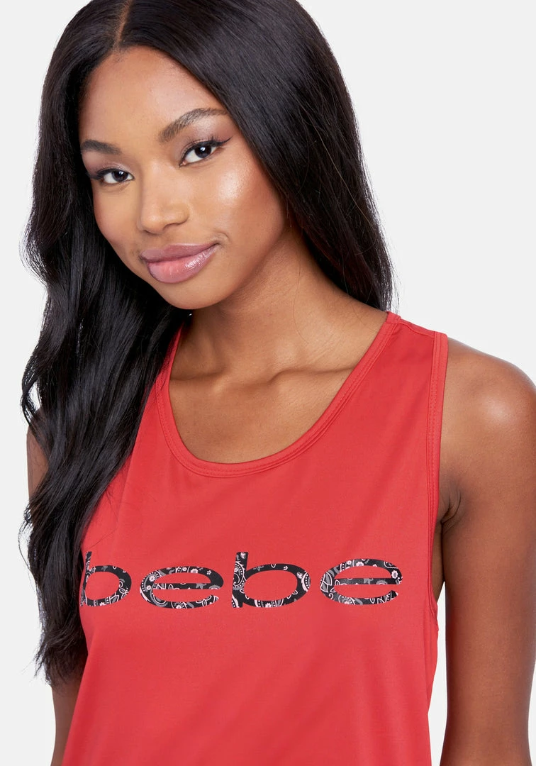The Bebe Sport Printed Logo Tank Top offers a casual style perfect for styling with leggings or jeans from the studio to the streets.