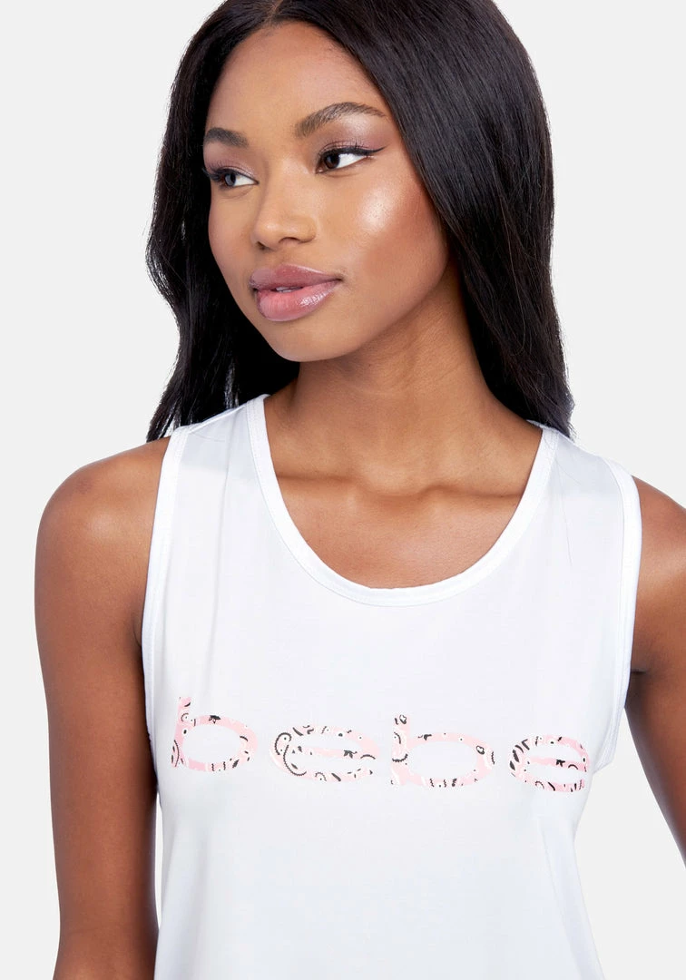 The Bebe Sport Printed Logo Tank Top offers a casual style perfect for styling with leggings or jeans from the studio to the streets.