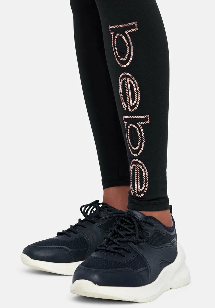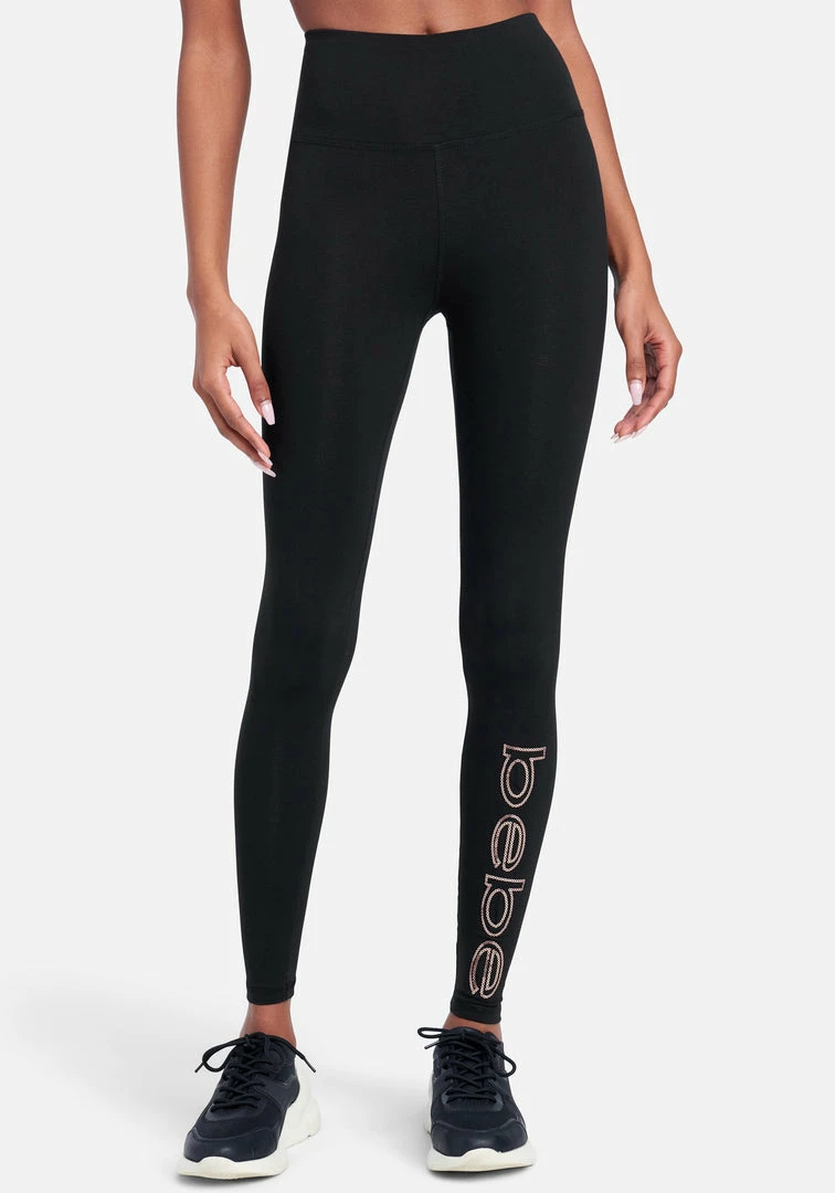Loungewear leggings that are oh-so-chic. These matching leggings feature a body-slimming silhouette and sequin Bebe logo down the leg.