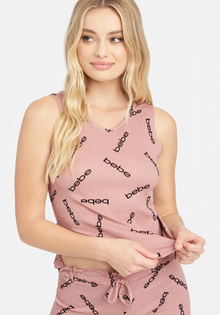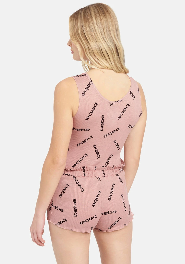 Waffle weave short set in the trending Bebe color of dusty rose. Featuring a soft material and all-over Bebe logo print.