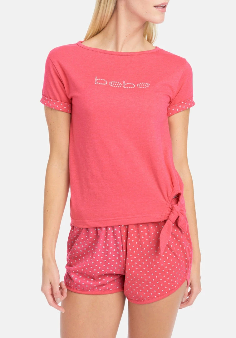 Jump into bed with this sporty and chic tank and short pajama set, featuring classic Bebe logo and chic polka dots.