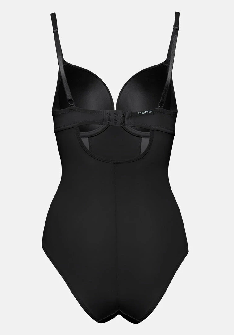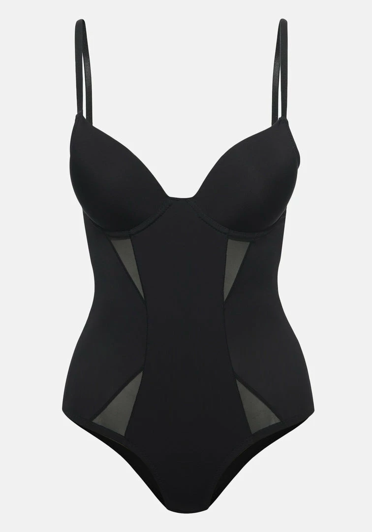 Classic bodysuit with a slimming effect and mesh cut out details. Adjustable straps and hook closure in back.