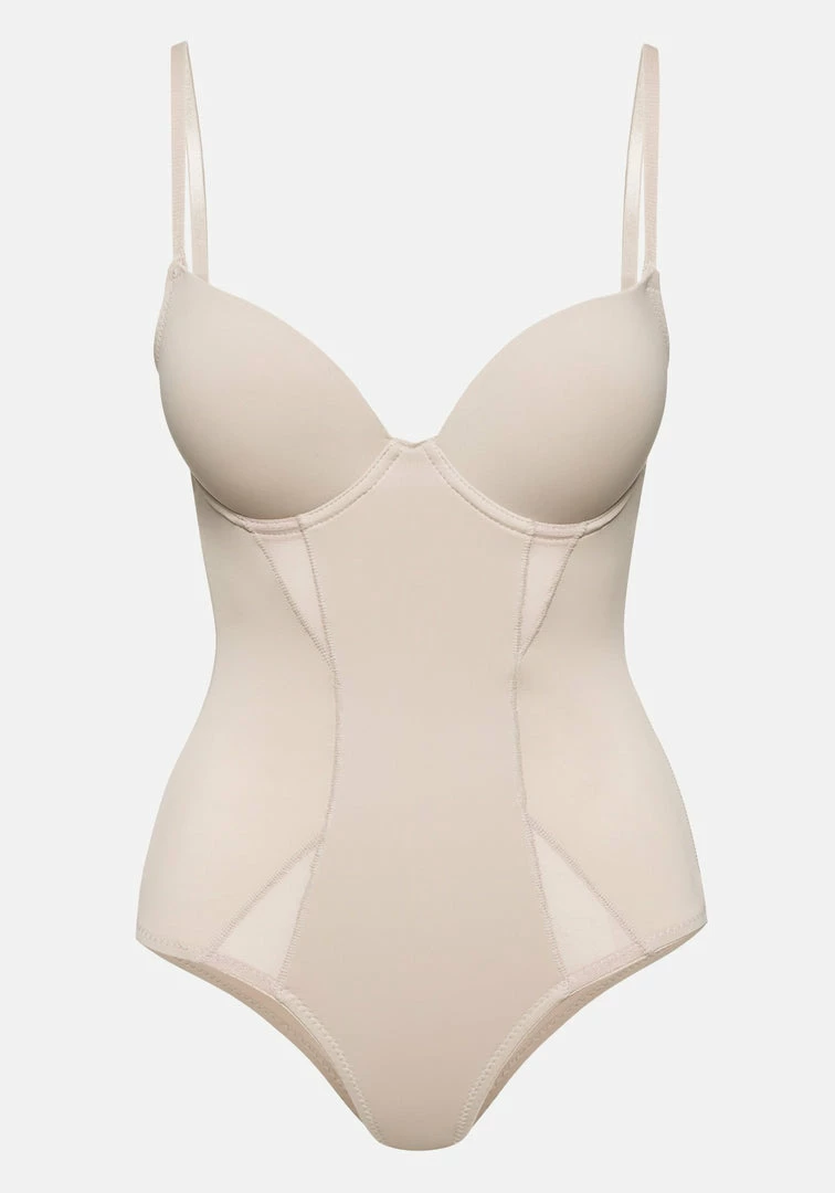 Classic bodysuit with a slimming effect and mesh cut out details. Adjustable straps and hook closure in back.