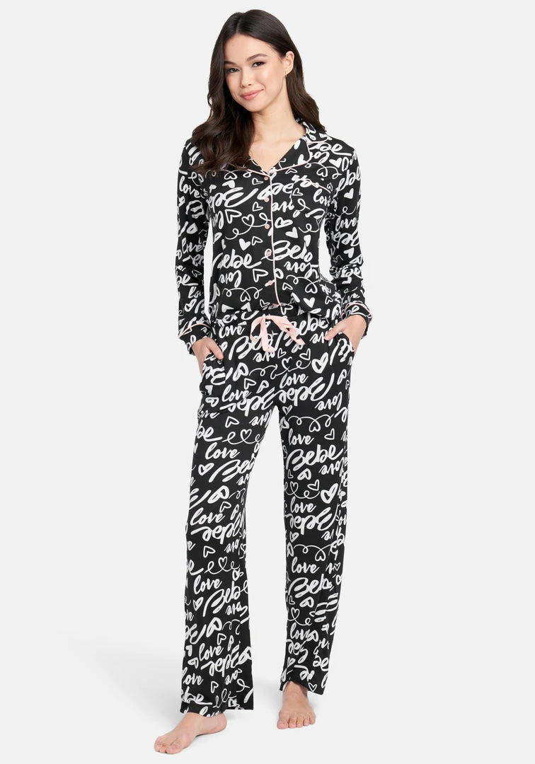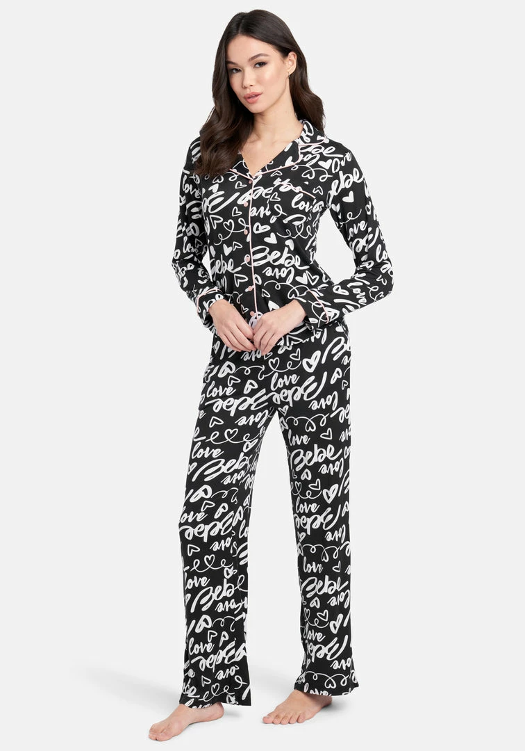 With an allover heart and logo print, this sweet sleep Notch Collar Pant Set is perfect for lounging or dreaming.