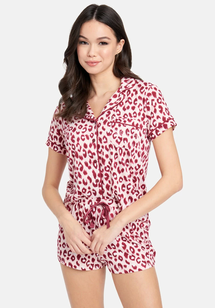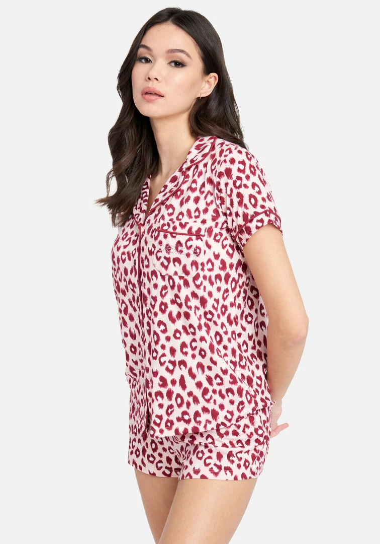 With an allover wild leopard print, this sweet sleep Notch Collar Pant Set is perfect for lounging or dreaming.