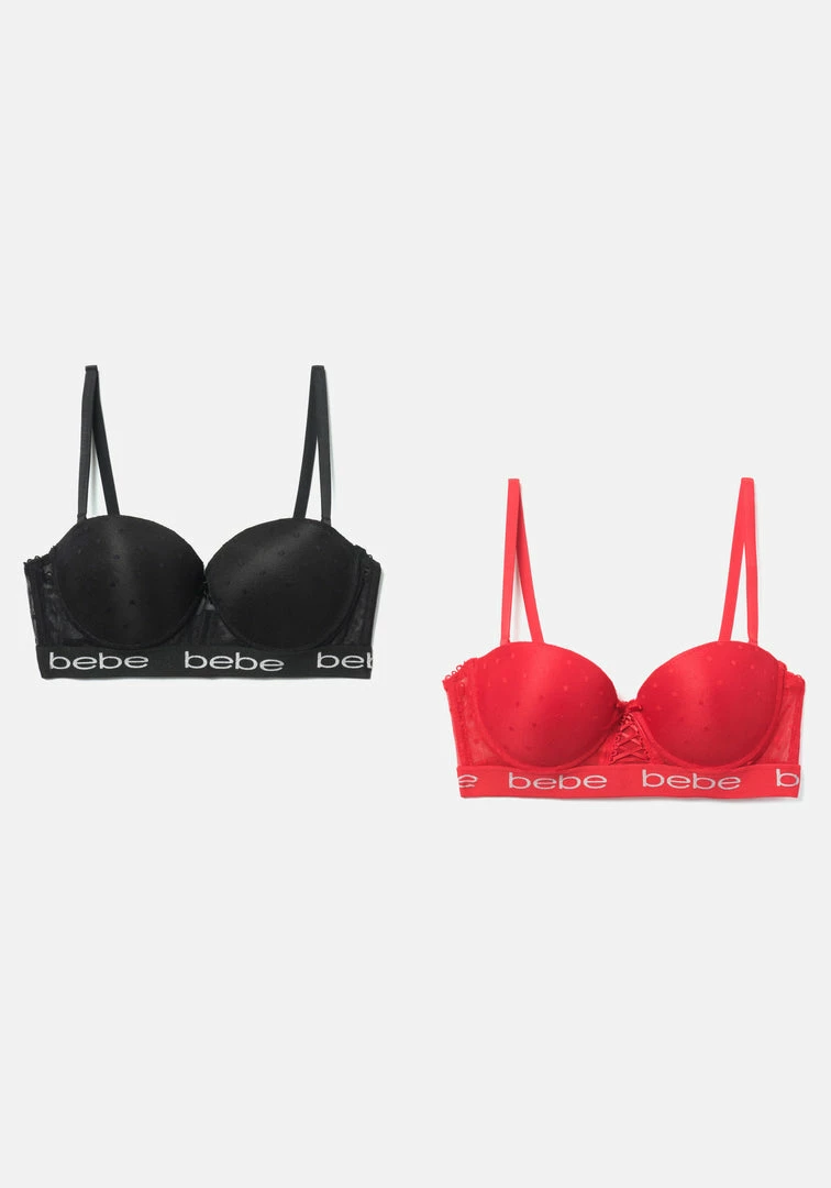 Simply stunning. This bra set features a black and red bra with a balconette design, our signature logo along with the band, and a front lace-up detail.