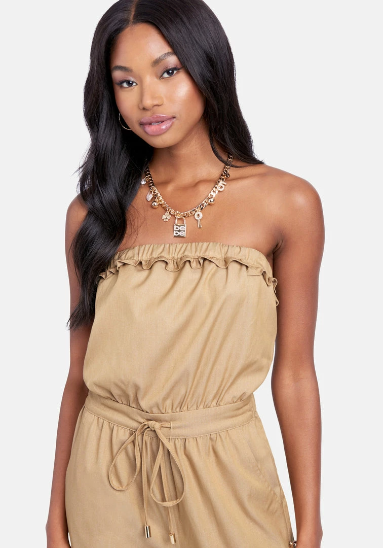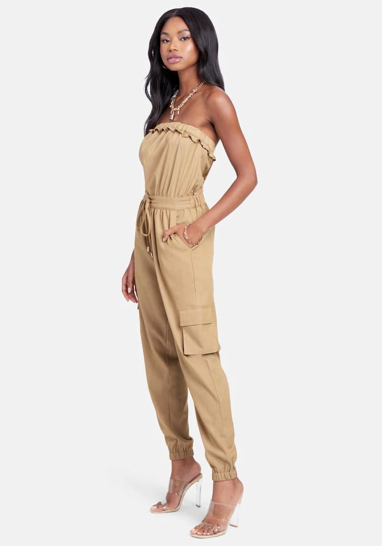 Command the attention of the room in the Bebe Strapless Cargo Pocket Jumpsuit featuring a drawstring waist, open pockets, and elastic cuffs. Style with heels or booties.