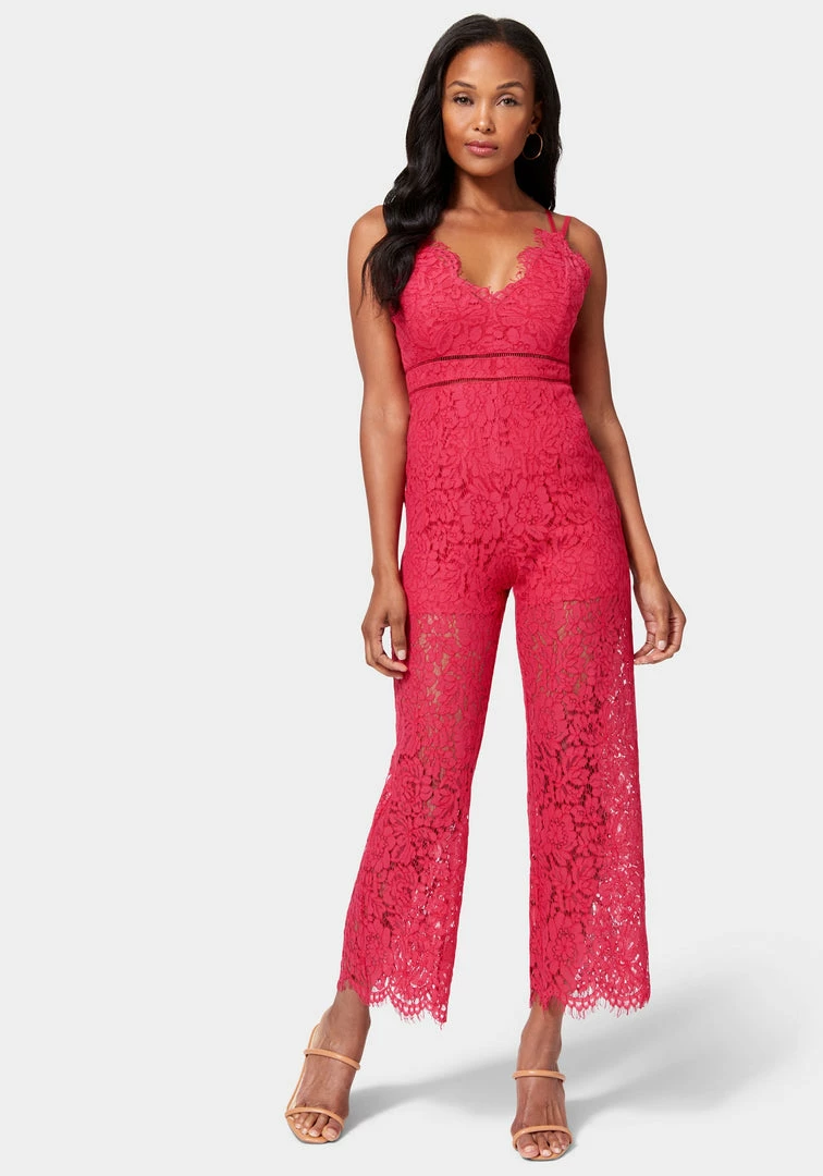 When your favorite dress has pant legs. This culotte jumpsuit features beautiful eyelash lace trim, a strappy back design, and adjustable cami straps.