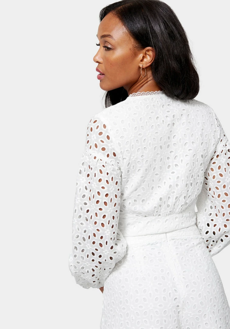 Eyes on you. This cropped blouse features soft eyelet embroidery, long balloon sleeves, and a button front for a breezy, feminine look. Make it a matching set with the Eyelet Detail Wide Leg Pant or pair it with your favorite jeans.