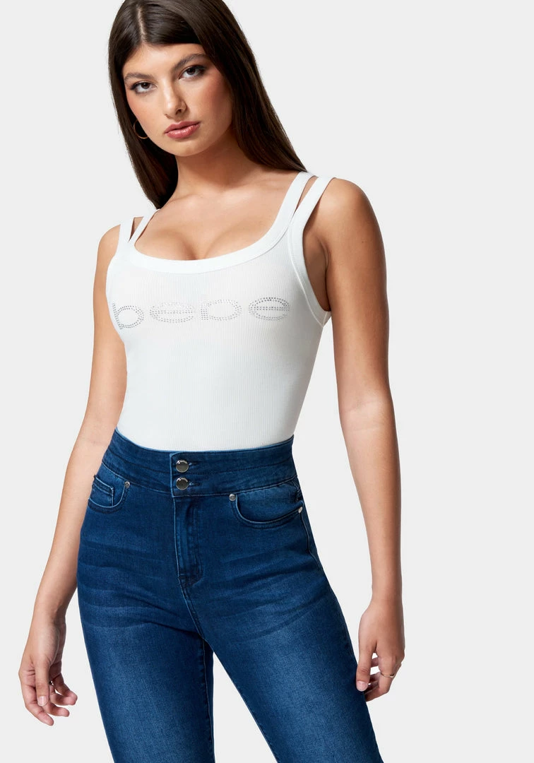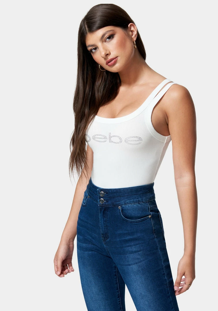 Our iconic Bebe Logo collection has a new baby sister. Made in a soft ribbed knit, this cropped tank top features strappy shoulders, rhinestone logo front, scoop neck, and a form-fitting style.