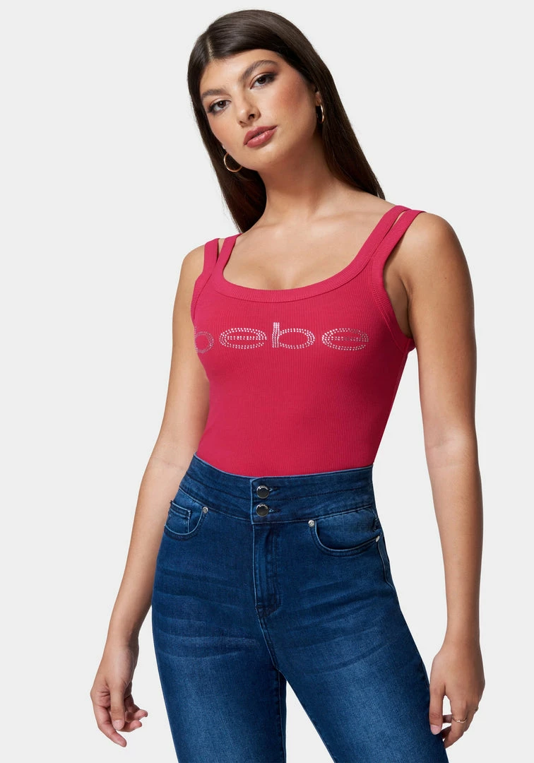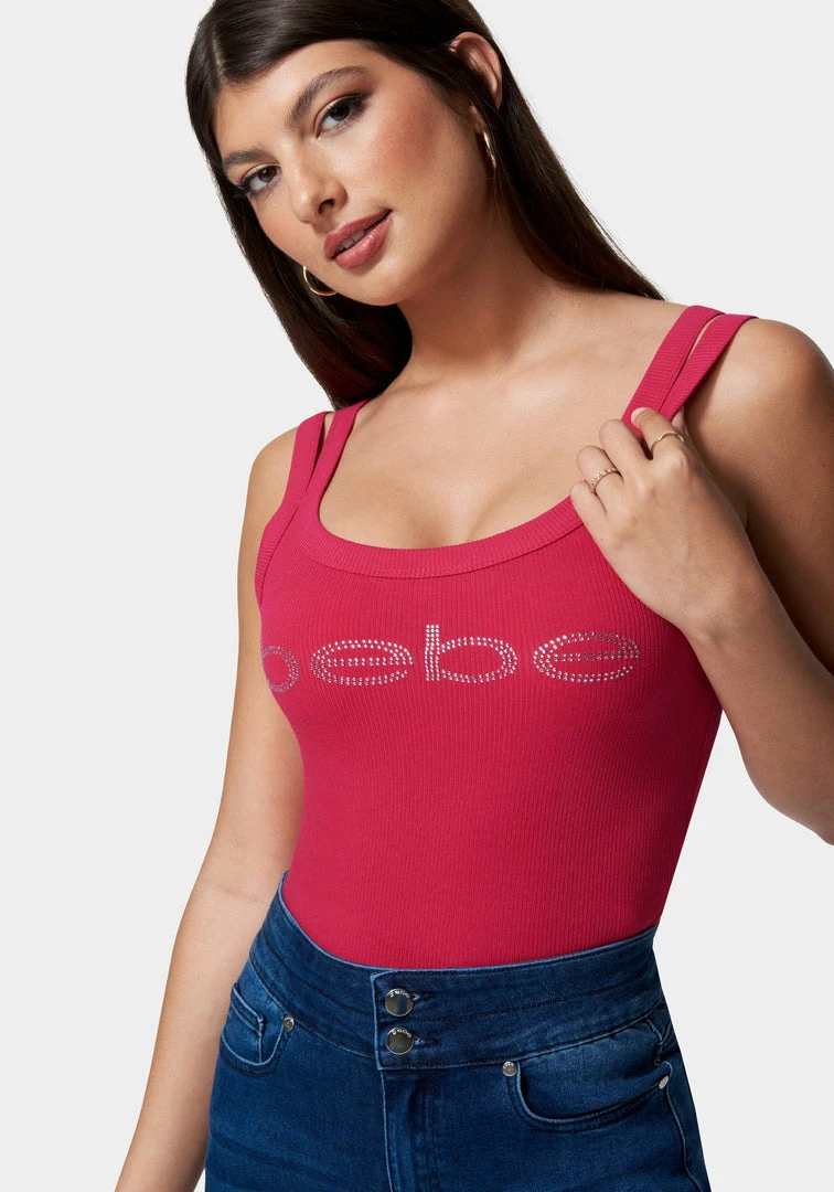Our iconic Bebe Logo collection has a new baby sister. Made in a soft ribbed knit, this cropped tank top features strappy shoulders, rhinestone logo front, scoop neck, and a form-fitting style.