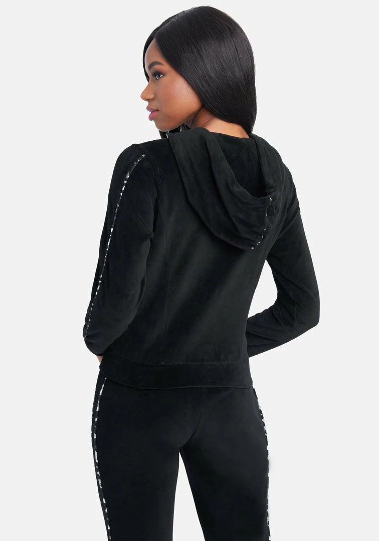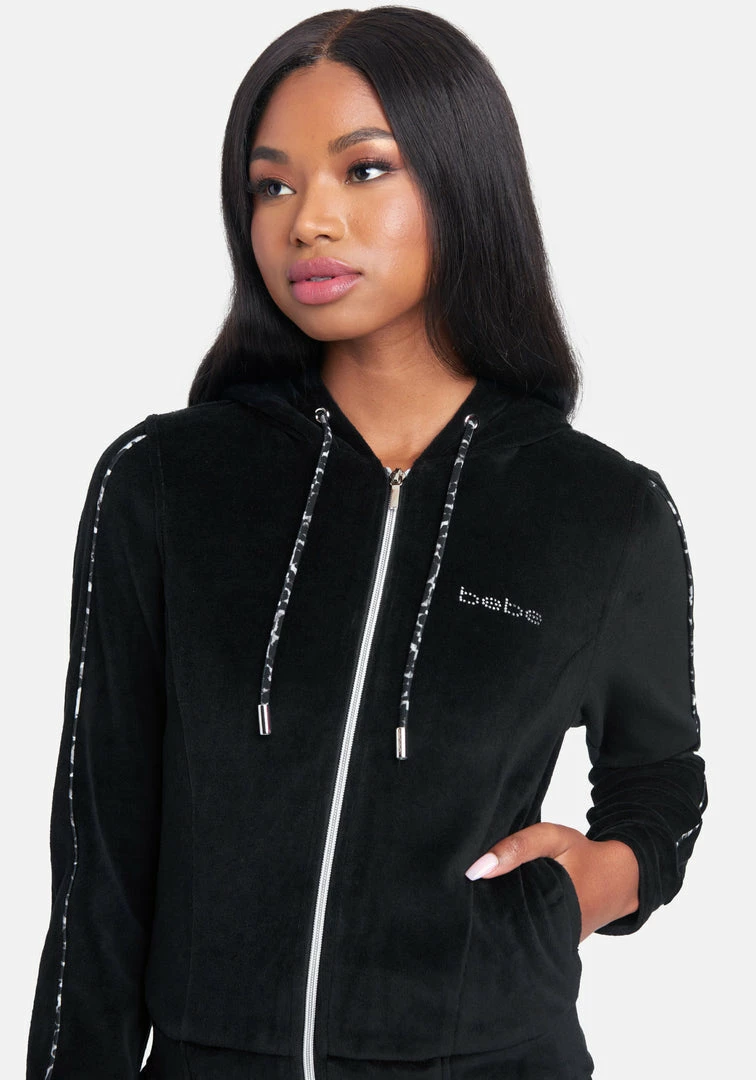 Lounge or travel in style with this plush velour hoodie. Cozy double pockets keep hands warm. Features a sparkly bebe logo and front zip with interlocking bb pull.