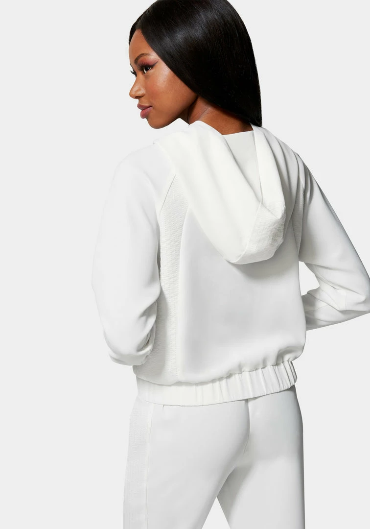 Come lounge with us. This zip-up hoodie features a crepe woven fabric with satin trim, a zip front, and an elasticized waist. Pairs with our matching Bebe Lux Lounge Crepe Jogger With Combo Satin.