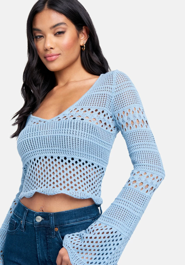 Embrace your inner boho child with our Bell Sleeve Crochet Top. Featuring an open-knit design, V-neck, long bell sleeves, and scalloped trim, you’ll want to add this to every off-duty look this season.