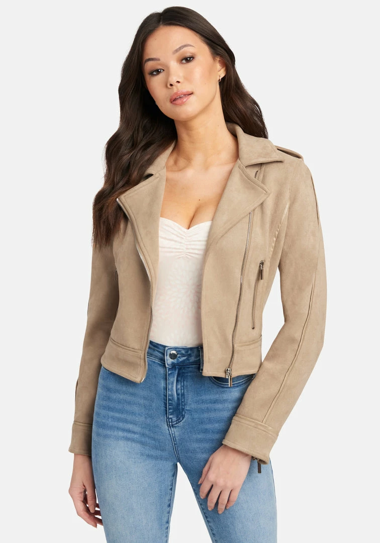 This super soft Vegan Suede Moto Jacket is a must-have piece that never goes out of style. Features a cropped fit and detailed hardware for added edge.