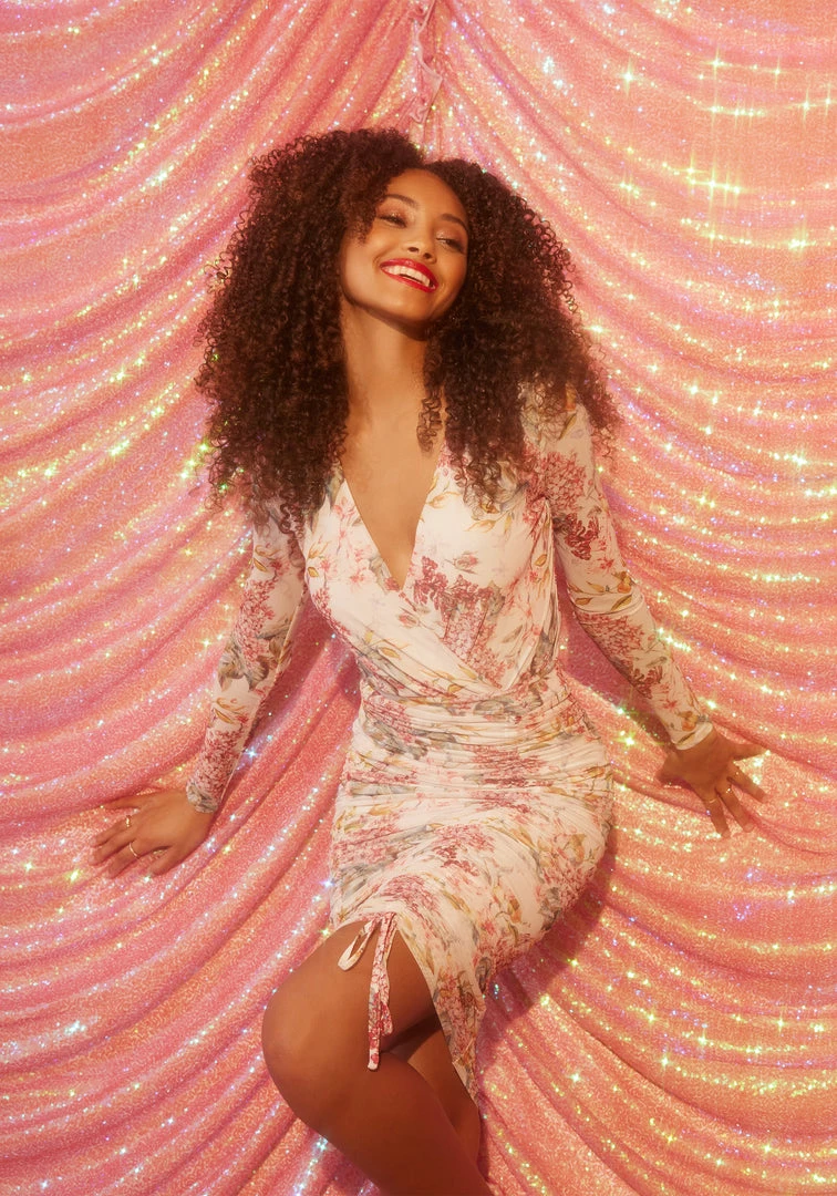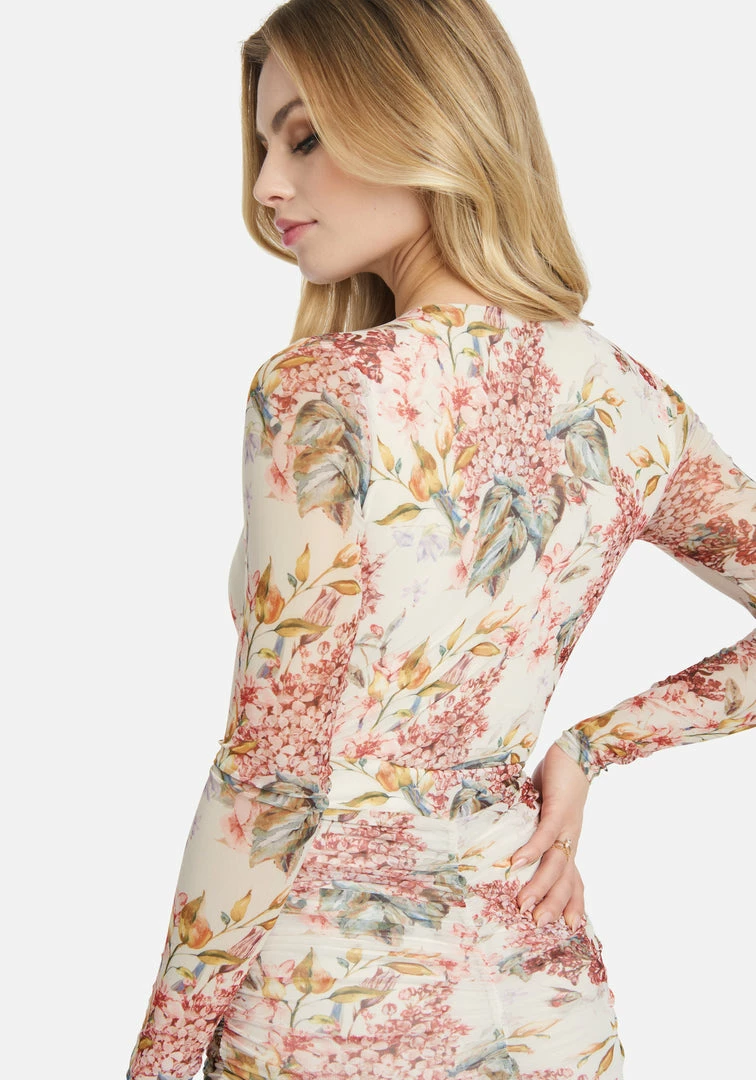 Floral printed mesh meets a flirty wrap front with this bodysuit. Style with its matching skirt for the ultimate romantic mood – or dress more casual with your favorite pair of jeans.
