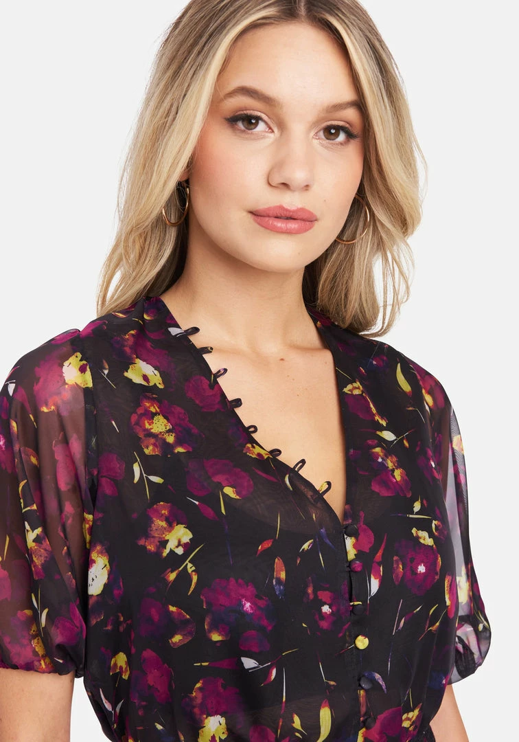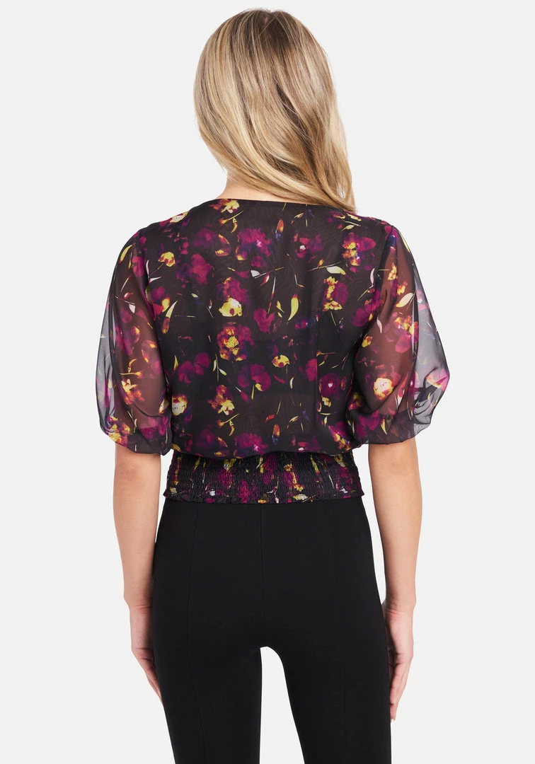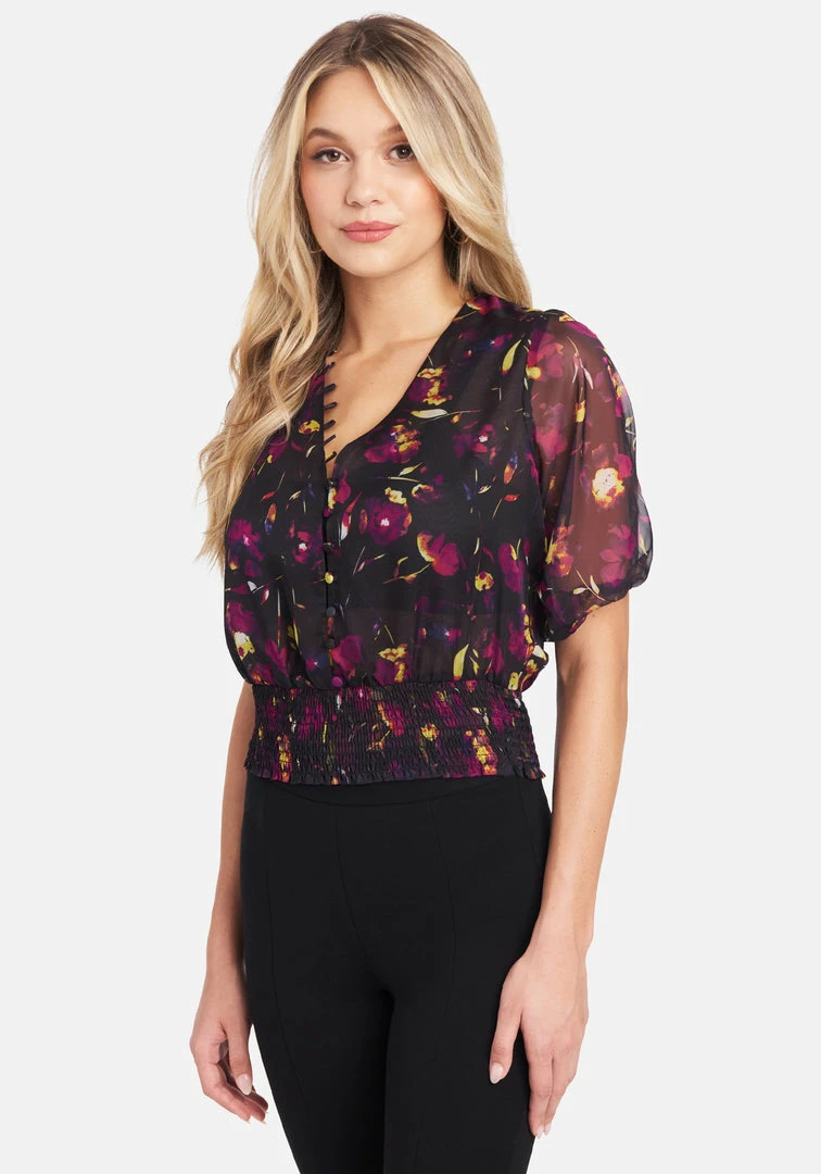 Such a cute and classic addition. This Chiffon Multi Button Smocked Hem Blouse features a dreamy watercolor floral print and a flattering fit.