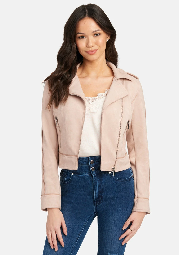 This super soft Vegan Suede Moto Jacket is a must-have piece that never goes out of style. Features a cropped fit and detailed hardware for added edge.